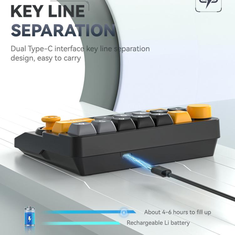 1. A compact 15-key wireless tri-mode mechanical gaming keyboard designed for precision and customization. Features hot-swappable switches, RGB backlighting for enhanced gaming performance.