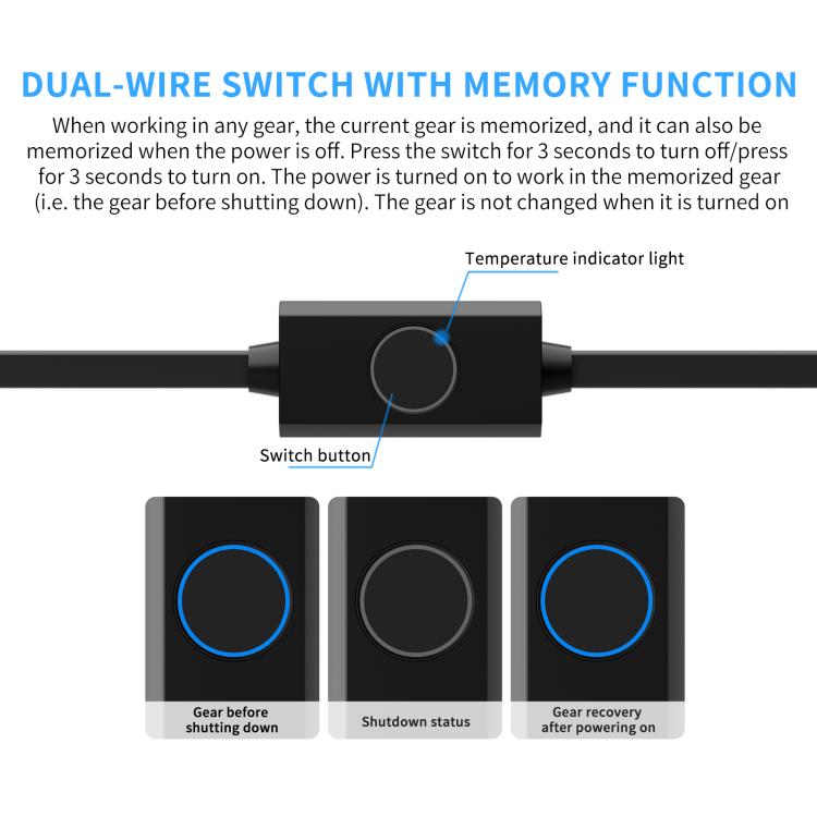 2. The current gear is memorized during operation, even after power failure. Press and hold the switch for 3 seconds to turn the device off, or press and hold for 3 seconds to turn it on.
