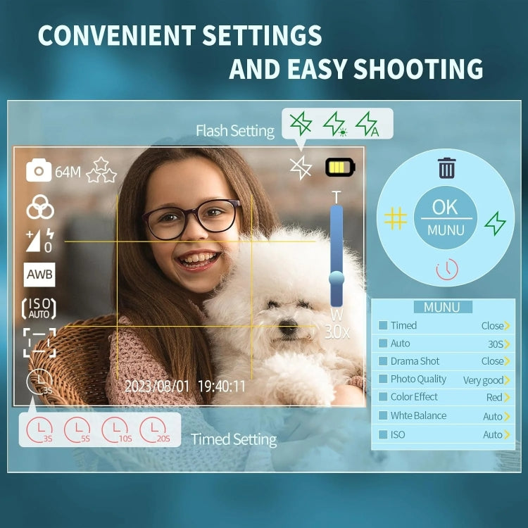 2. Built-in night vision flash, face recognition, continuous shooting, photo countdown, built-in microphone and speaker (recording sound and video), it is a very cost-effective digital camera. Easy to operate, it is also an ideal gift for parents and children