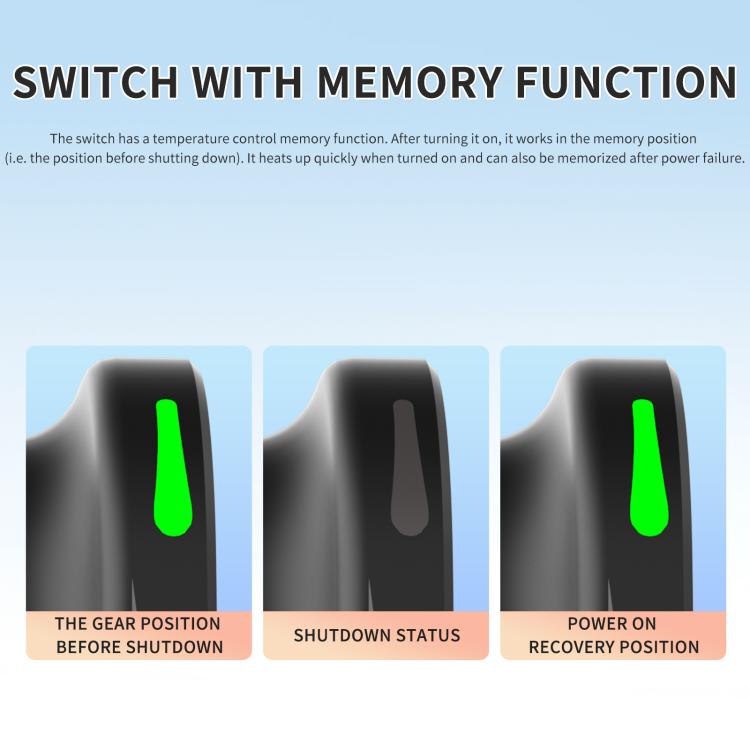 4. The switch has a temperature control memory function, allowing the device to operate in the memorized setting (i.e., the setting before power off) upon power on, with intelligent and rapid temperature rise upon power on.