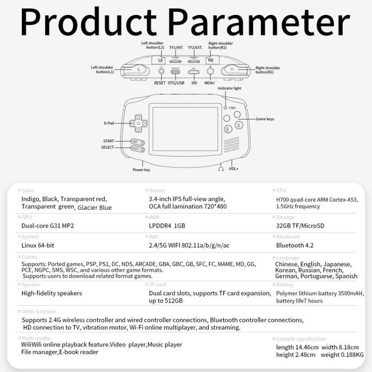 13. Other functions: support 2.4G wireless controller and wired controller connection, Bluetooth controller connection, HDMI connection to TV, vibration motor, WIFI online play, streaming