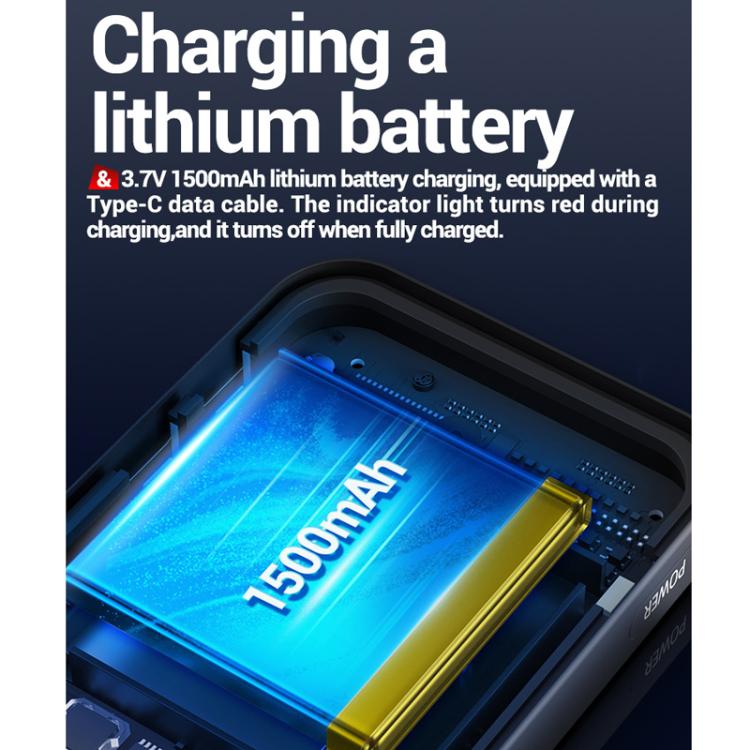 28. 3.7V 1500mAh lithium battery charging, equipped with a Type-c data cable, the charging indicator light is red, and the full indicator light is not on