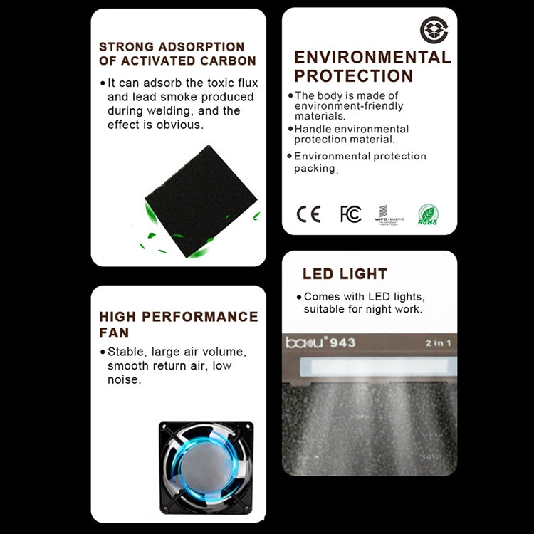 Baku BA-943 Soldering Fume Purifier with LED Light 30W Soldering Iron Welding Fume Exhauster(US Plug 110V)