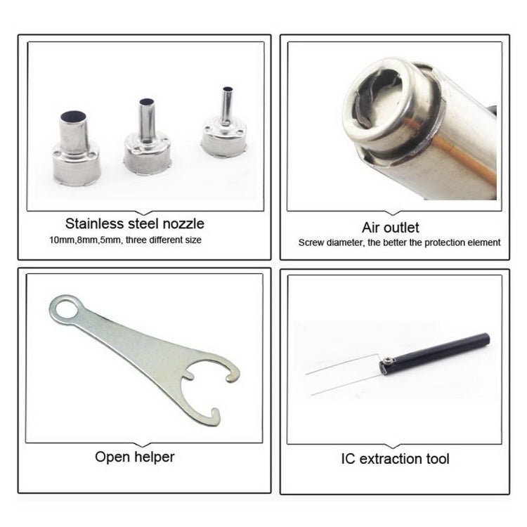 4. The system is equipped with automatic cold air function, when cooled, automatically enter power-saving state, can prolong the life of the heating element and protect the hot air gun.