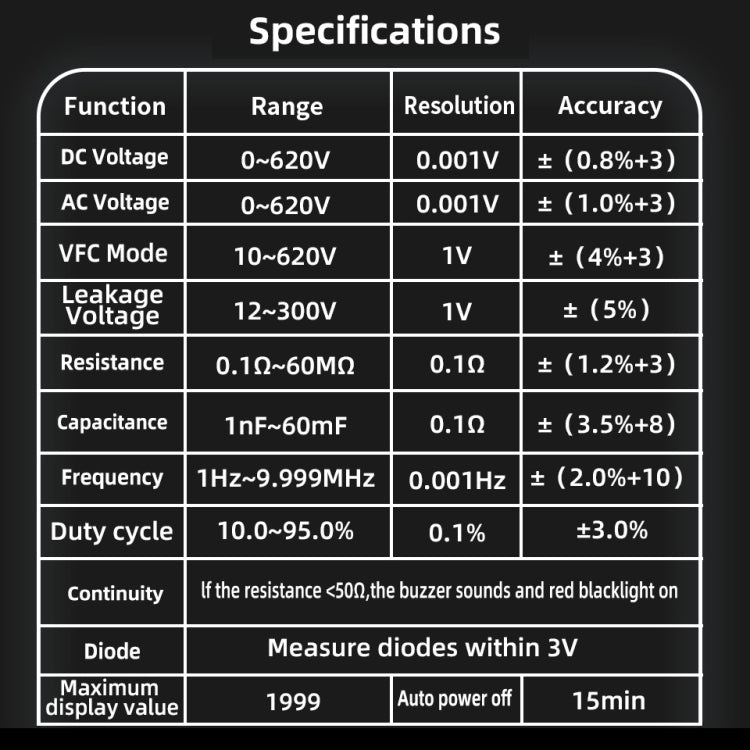 11. Other functions: auto-ranging, on/off testing, diode testing, auto power off, screen backlight