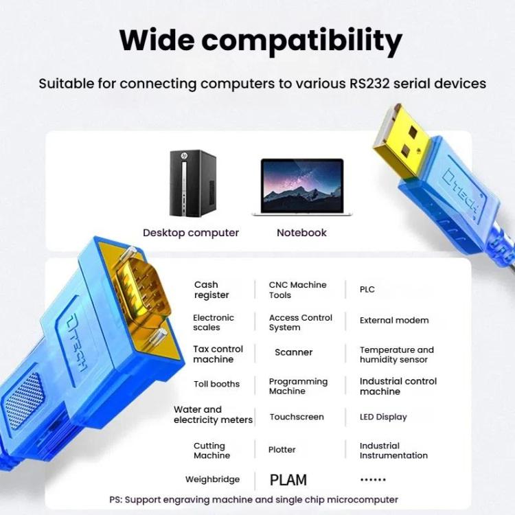 1. Interface type: USB-A male to DB9 male (RS-232).