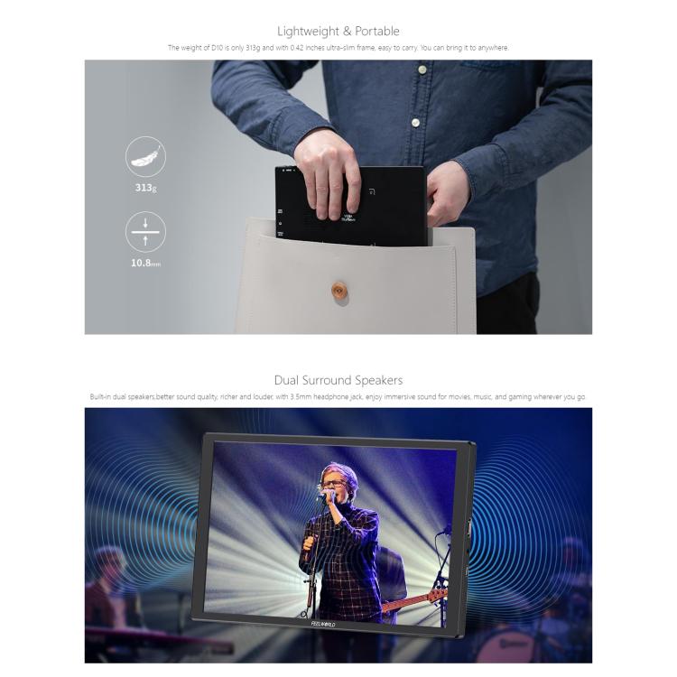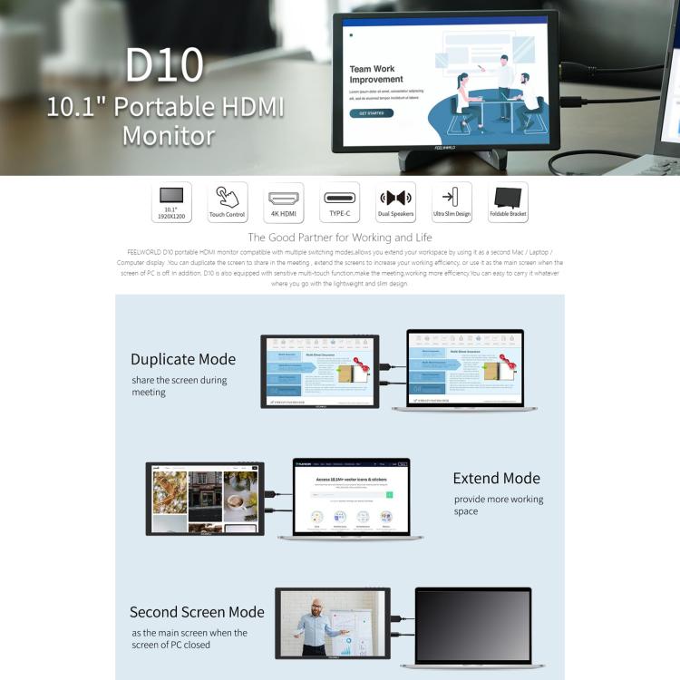 FEELWORLD D10 10.1 inch Portable External Monitor Touch FHD 1920 x 1200 USB-C HDMI-compatible Screen(Black)