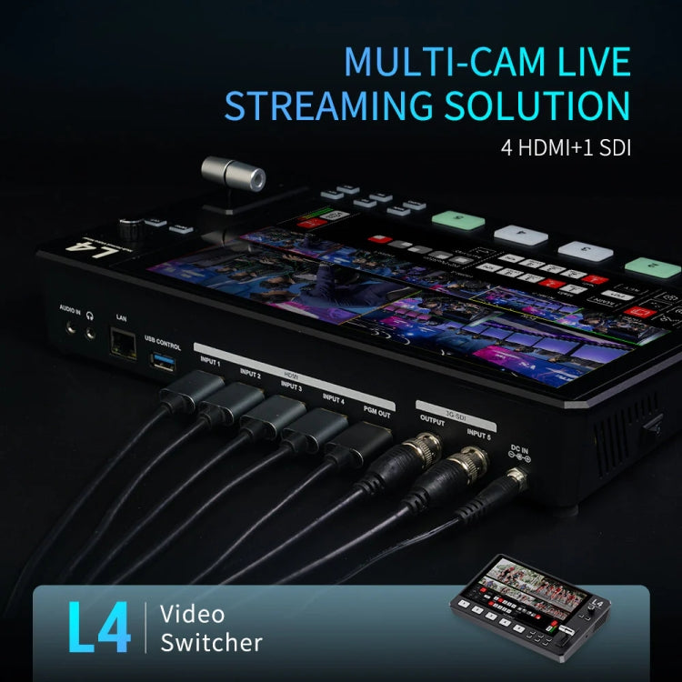 1. FEELWORLD L4 video switcher with 4 x HDMI and 1 x SDI, it can support various types of input and output devices. This allows for greater flexibility in connecting different equipment to the switcher, enabling seamless switching between sources during live productions.