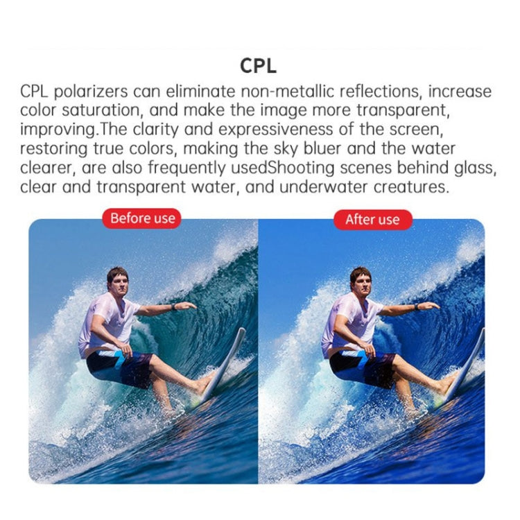 4. CPL Filters: Increases color saturation, creating deep, rich scenic images. Helps to reduce the amount of light entering the lens.
