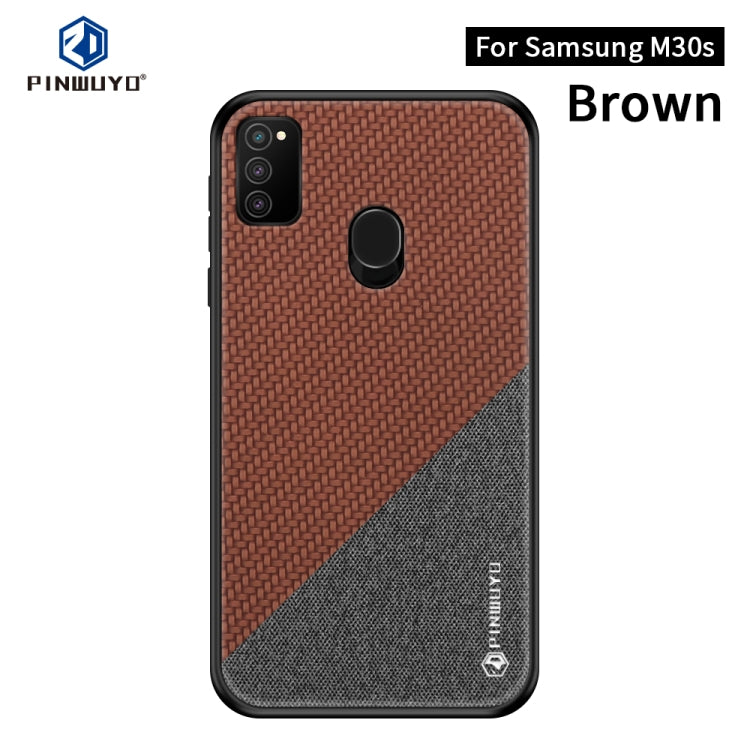 For Galaxy M30S PINWUYO Rong Series Shockproof PC + TPU+ Chemical Fiber Cloth Protective Cover(Brown)