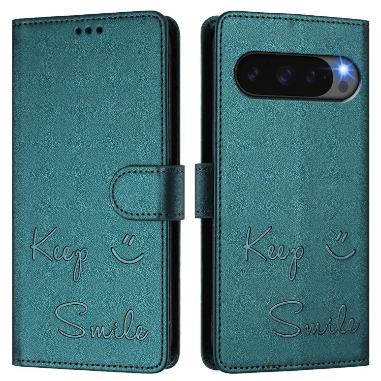 For Google Pixel 10 Pro XL 5G Global Smile Embossing RFID Leather Phone Case(Peacock Green)