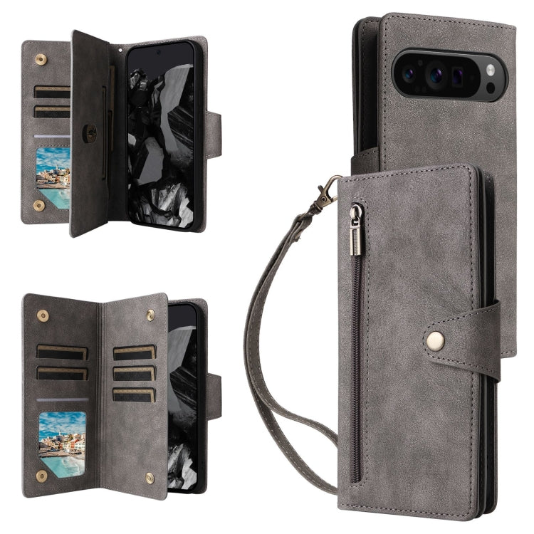 For Google Pixel 9 Pro Rivet Buckle 9 Cards Three Fold Leather Phone Case(Grey)