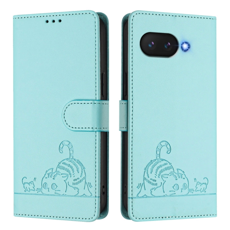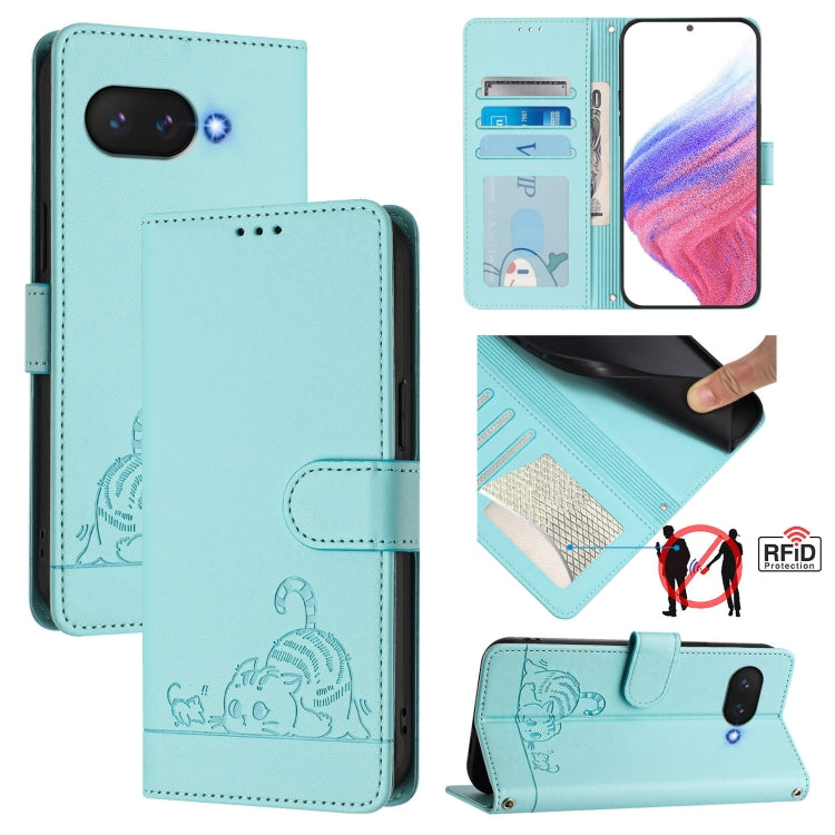 For Google Pixel 9a Cat Rat Embossed Pattern RFID Leather Phone Case with Lanyard(Mint Green)