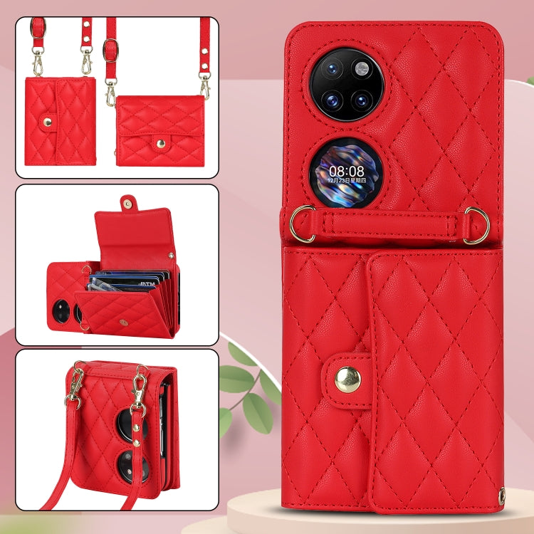 For Huawei P50 Pocket Rhombic Texture Card Bag PU Phone Case with Long Lanyard(Red)