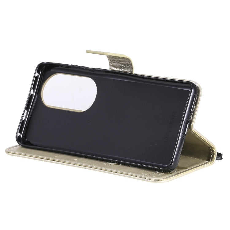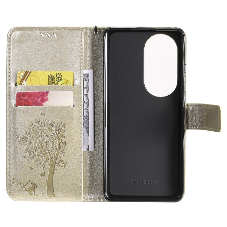 For Huawei P50 Pro Tree & Cat Pattern Pressed Printing Horizontal Flip PU Leather Case with Holder & Card Slots & Wallet & Lanyard(Gold)