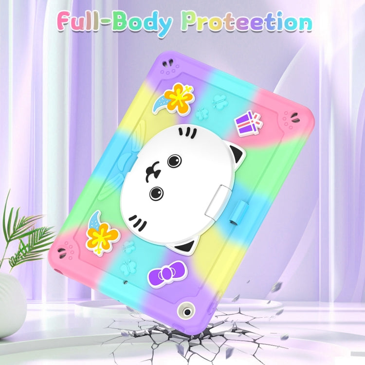 For iPad 10.2 2021 / 2020 / 2019 Cat Holder Silicone Hybrid PC Tablet Case with Strap(Colorful Purple)