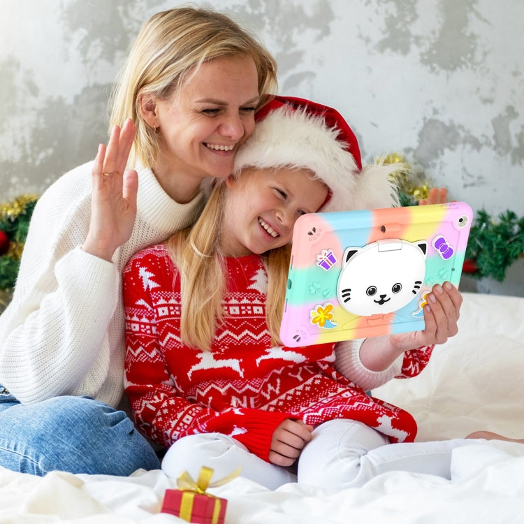 For iPad 10.2 2021 / 2020 / 2019 Cat Holder Silicone Hybrid PC Tablet Case with Strap(Colorful Rose Gold)