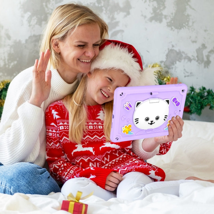 For iPad 10.2 2021 / 2020 / 2019 Cat Holder Silicone Hybrid PC Tablet Case with Strap(Purple)