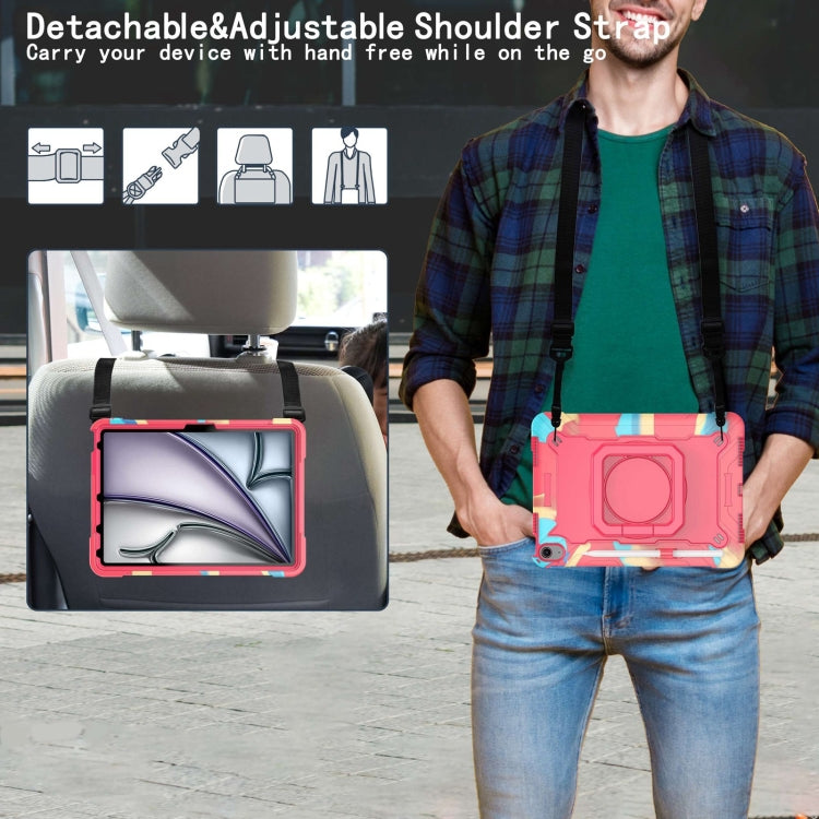 For iPad Air 11 2025 / 2024 Handle Grip Holder Silicone Hybrid PC Tablet Case with Strap(Camouflage Rose Red)