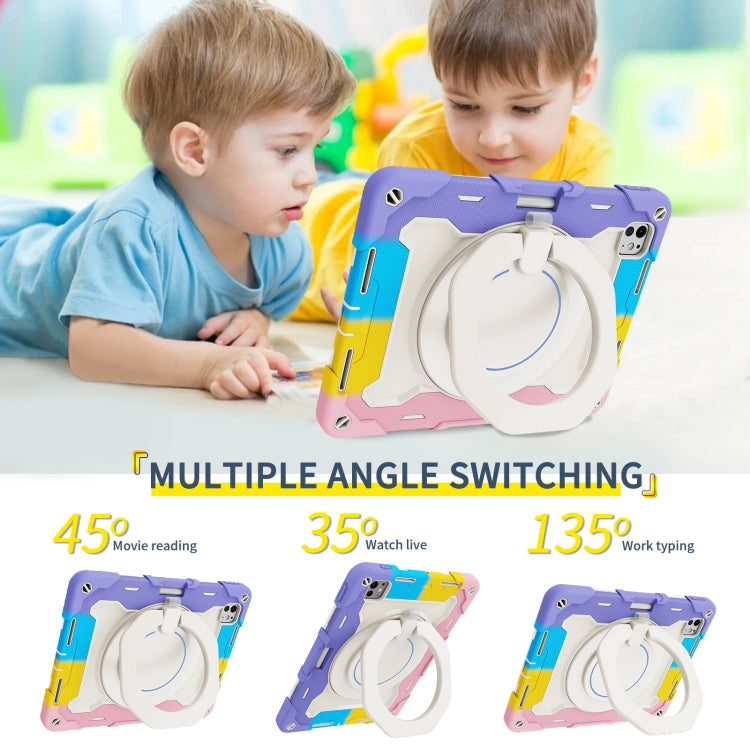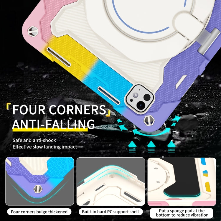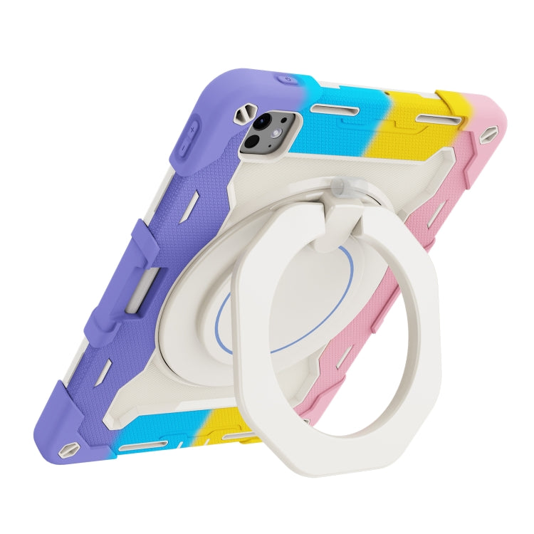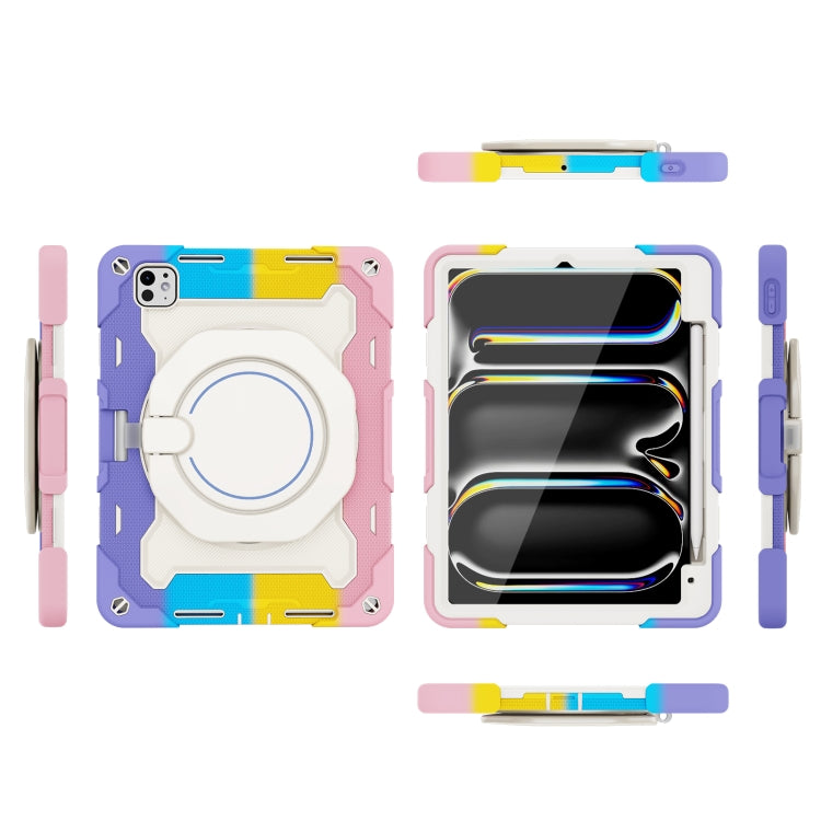 For iPad Pro 11 2024 Armor Portable Rotating Ring Holder Silicone Tablet Case with Pen Slot(Colorful Pink)