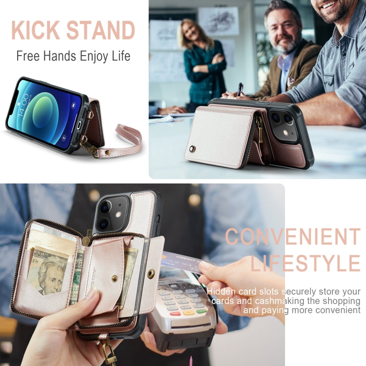 For iPhone 12 JEEHOOD C22 Series Zipper Wallet Leather Phone Case with Dual Lanyard(Rose Gold)