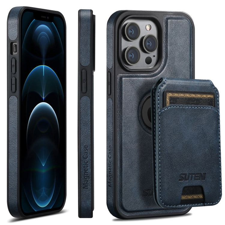 For iPhone 12 Pro Max Suteni M2 Oil Wax MagSafe Horizontal Card Bag Phone Case(Blue)