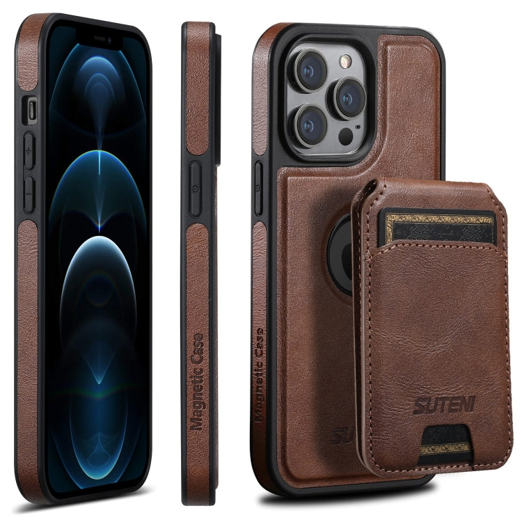For iPhone 12 Pro Max Suteni M2 Oil Wax MagSafe Horizontal Card Bag Phone Case(Brown)
