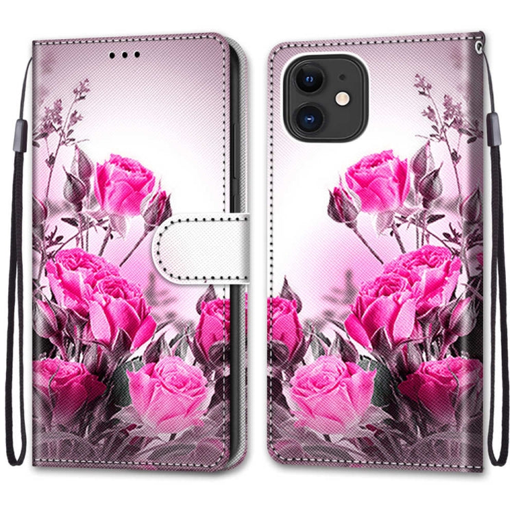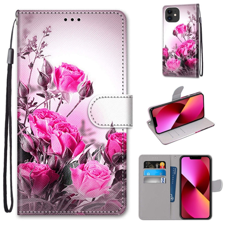 For iPhone 13 Coloured Drawing Cross Texture Horizontal Flip PU Leather Case with Holder & Card Slots & Wallet & Lanyard(Wild Rose)