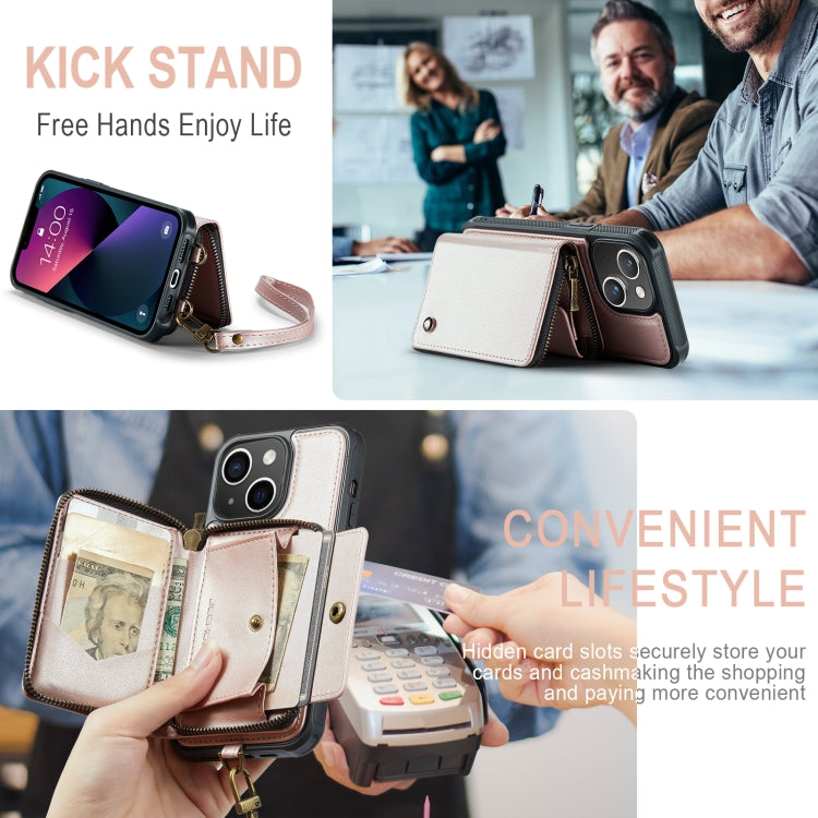 For iPhone 13 JEEHOOD C22 Series Zipper Wallet Leather Phone Case with Dual Lanyard(Rose Gold)