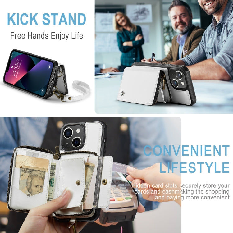 For iPhone 13 JEEHOOD C22 Series Zipper Wallet Leather Phone Case with Dual Lanyard(White)