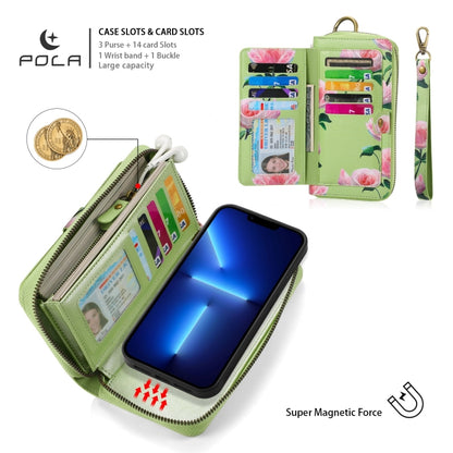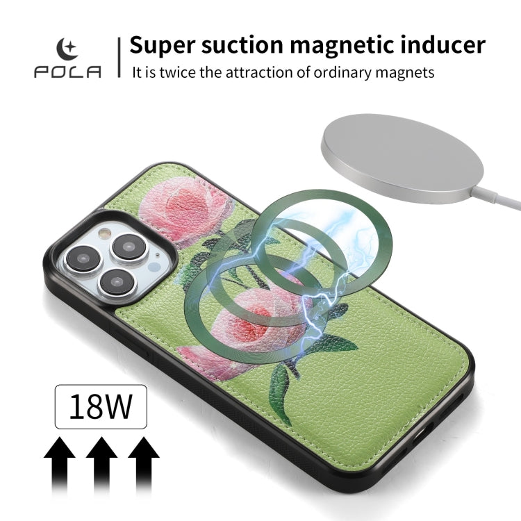 For iPhone 13 POLA MagSafe Flower Multi-functional Zipper Wallet Leather Phone Case(Green)