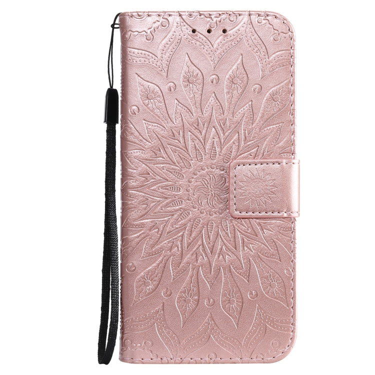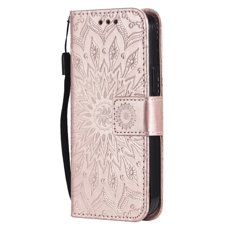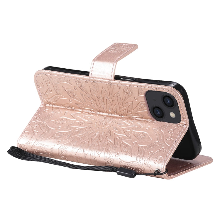 For iPhone 13 Pressed Printing Sunflower Pattern Horizontal Flip PU Leather Case Holder & Card Slots & Wallet & Lanyard(Rose Gold)