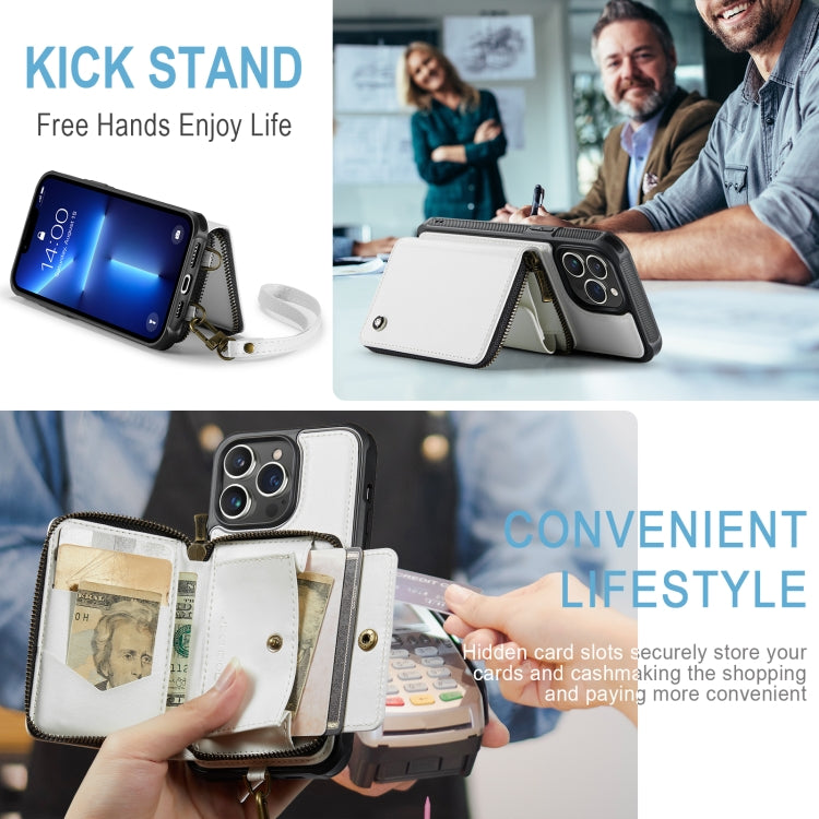 For iPhone 13 Pro JEEHOOD C22 Series Zipper Wallet Leather Phone Case with Dual Lanyard(White)