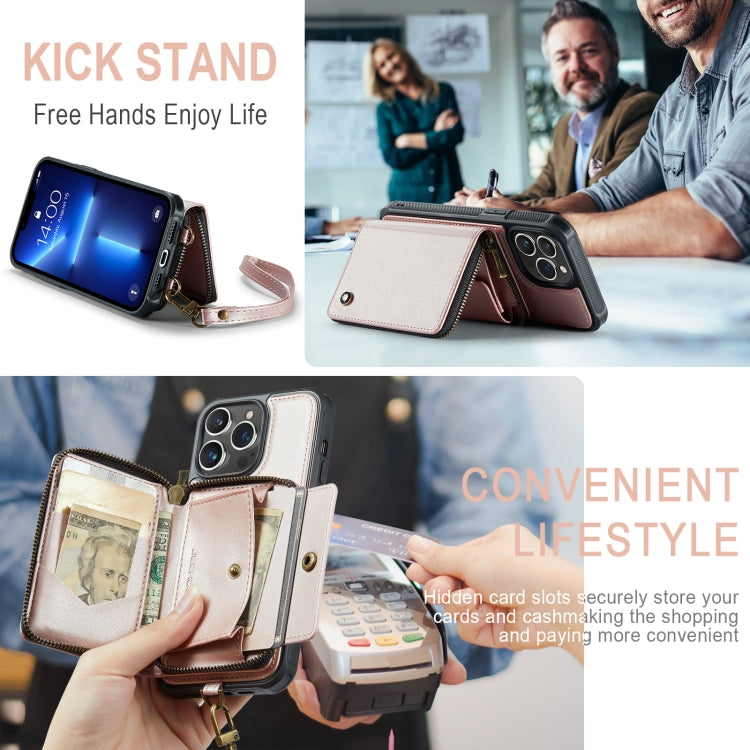For iPhone 13 Pro Max JEEHOOD C22 Series Zipper Wallet Leather Phone Case with Dual Lanyard(Rose Gold)