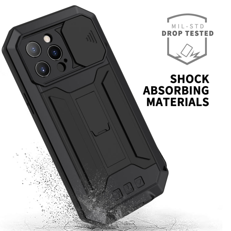 For iPhone 13 Pro R-JUST Sliding Camera Shockproof Life Waterproof Dust-proof Metal + Silicone Protective Case with Holder (Black)