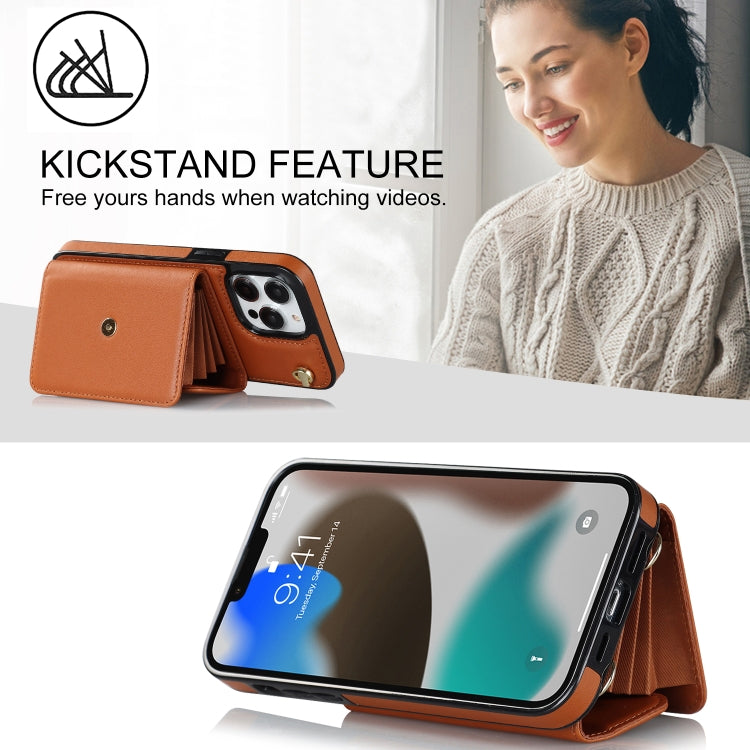 For iPhone 13 Pro RFID Card Slot Phone Case with Long Lanyard(Brown)