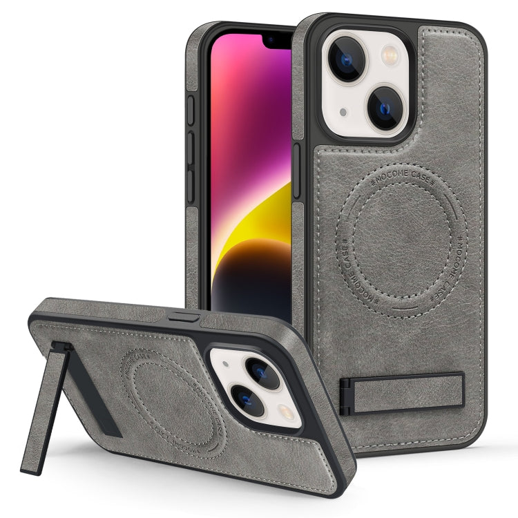 For iPhone 14 Plus Multi-function Holder MagSafe PU Phone Case(Gray)