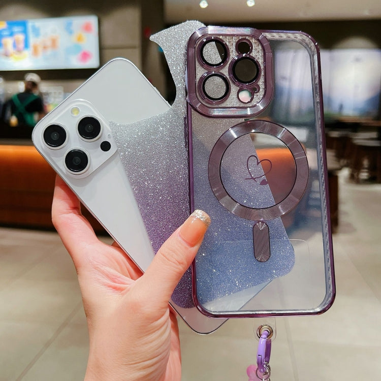 For iPhone 14 Pro Max Loves Gradient Glitter Bracelets Carbon Fiber Magsafe TPU Phone Case(Blue)