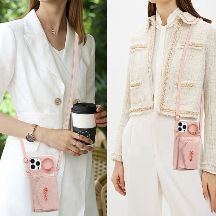 For iPhone 14 Pro Max VIETAO Ring Holder Wallet PU Phone Case with Lanyard(Pink)