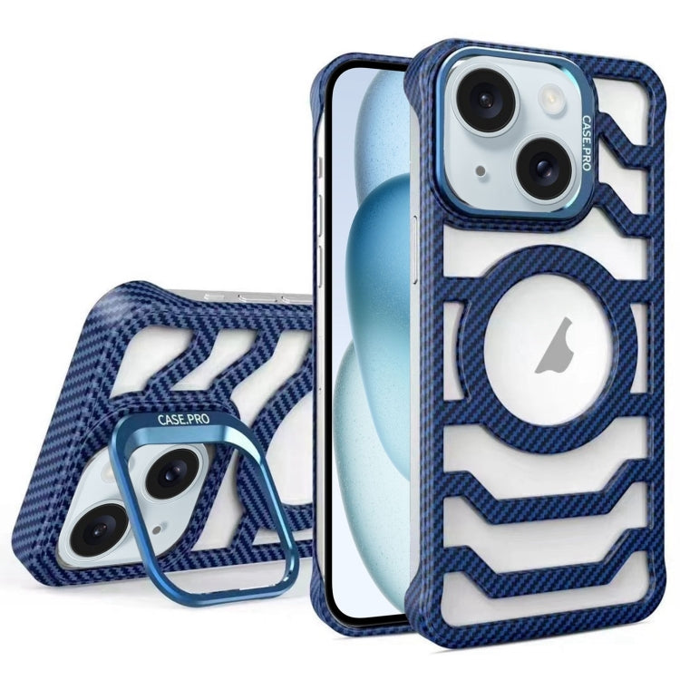 For iPhone 15 Borderless Carbon Fiber Lens Protection Bracket MagSafe Phone Case(Blue)