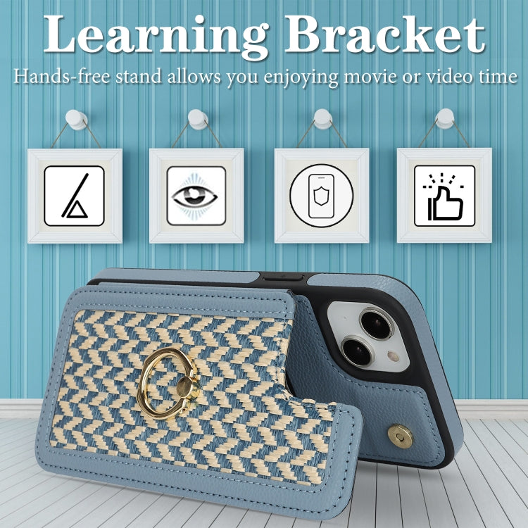For iPhone 15 Double Bckle Card Slot Full Coverage Phone Case with Cross-body Strap(Blue)