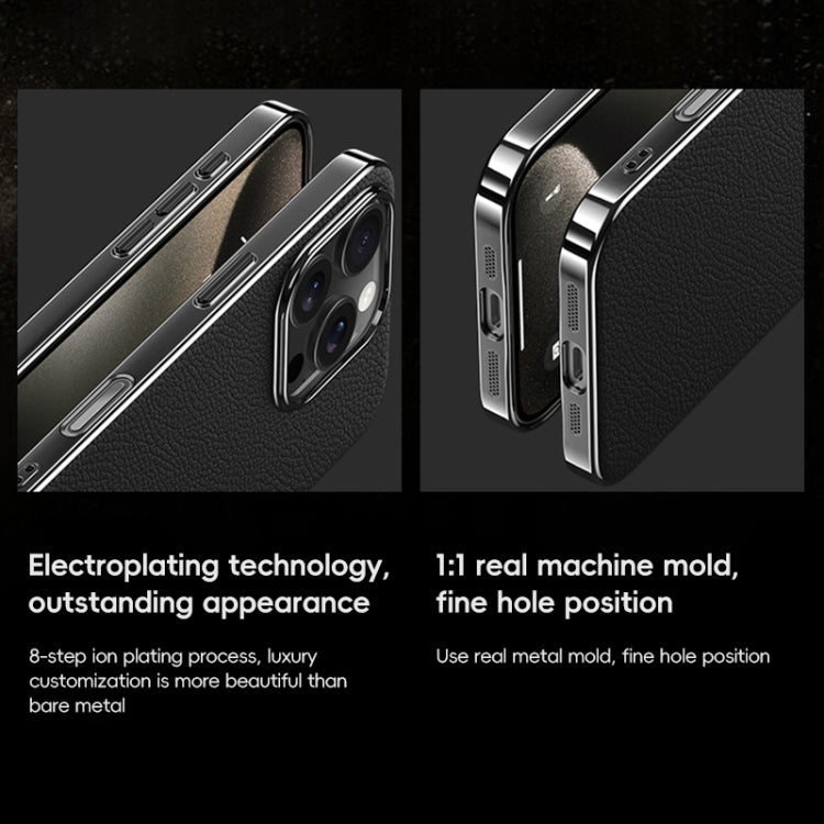 For iPhone 15 First Layer Cowhide Leather Electroplated PC Phone Case(White)