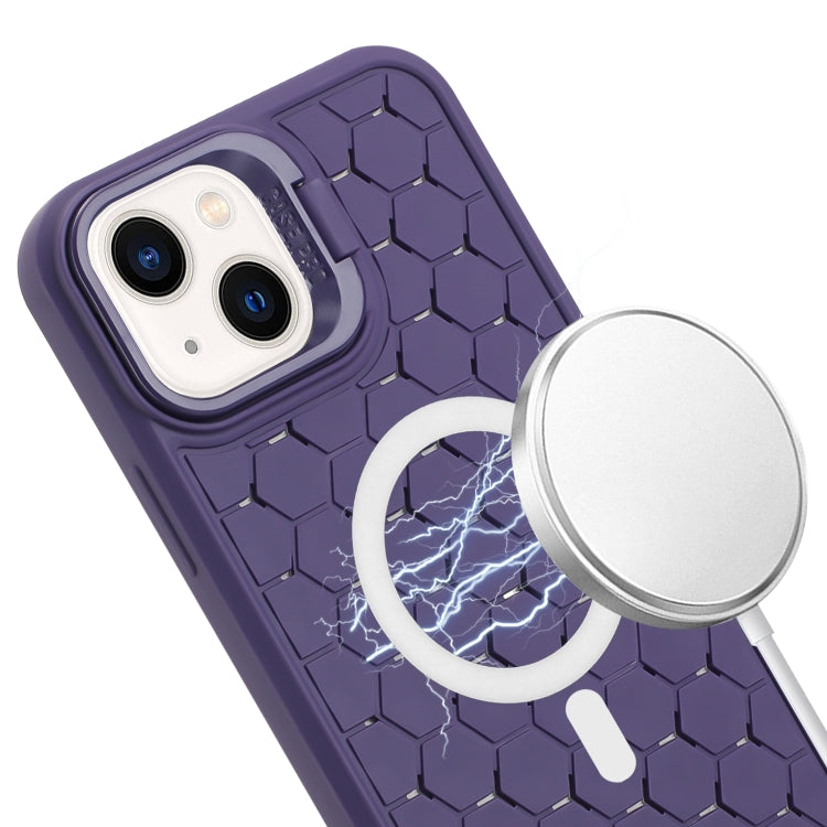 For iPhone 15 Honeycomb Radiating Lens Holder Magsafe Phone Case with Lanyard(Purple)