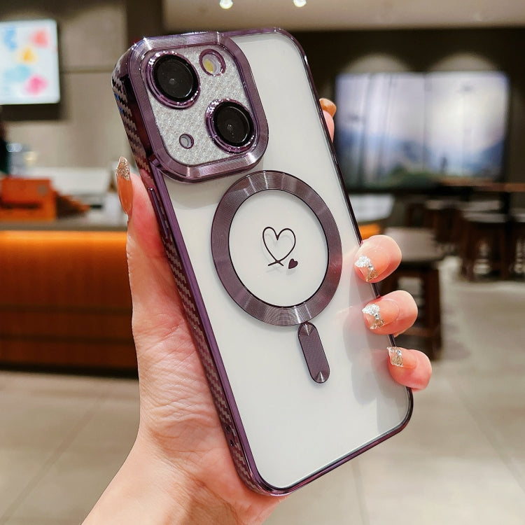 For iPhone 15 Loves Carbon Fiber Clear Plated Magsafe TPU Phone Case(Purple)