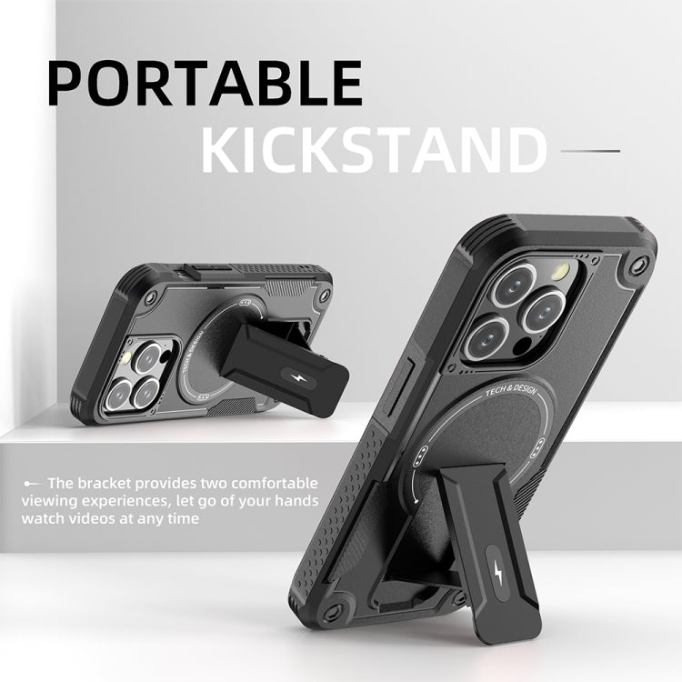 For iPhone 15 Armor Magsafe Holder PC Hybrid TPU Phone Case(Black)