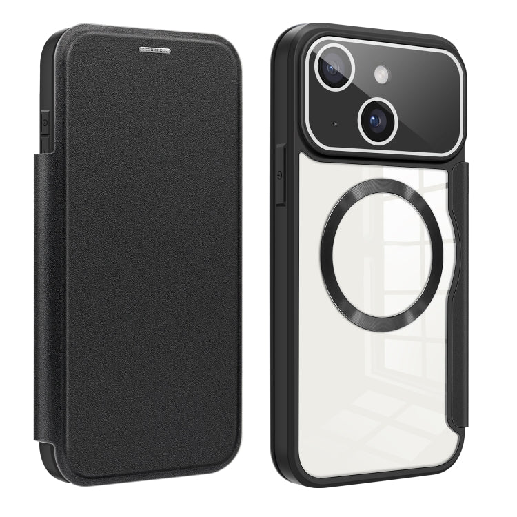 For iPhone 15 Plus Colored Shield MagSafe Magnetic RFID Anti-theft Leather Phone Case(Black)