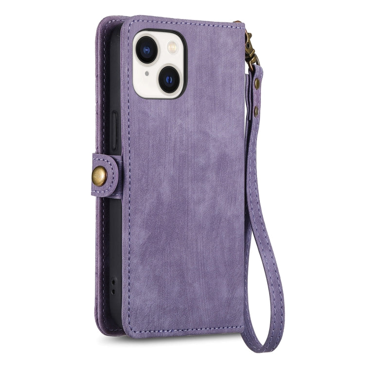 For iPhone 15 Plus Geometric Zipper Wallet Side Buckle Leather Phone Case(Purple)