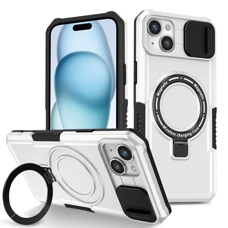 For iPhone 15 Plus Sliding Camshield MagSafe Holder TPU Hybrid PC Phone Case(Black White)