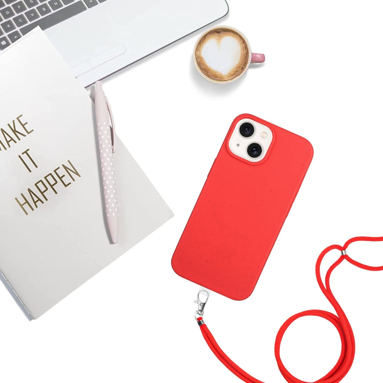 For iPhone 15 Plus Wheat MagSafe Magnetic Straw Material + TPU Phone Case with Lanyard(Red)