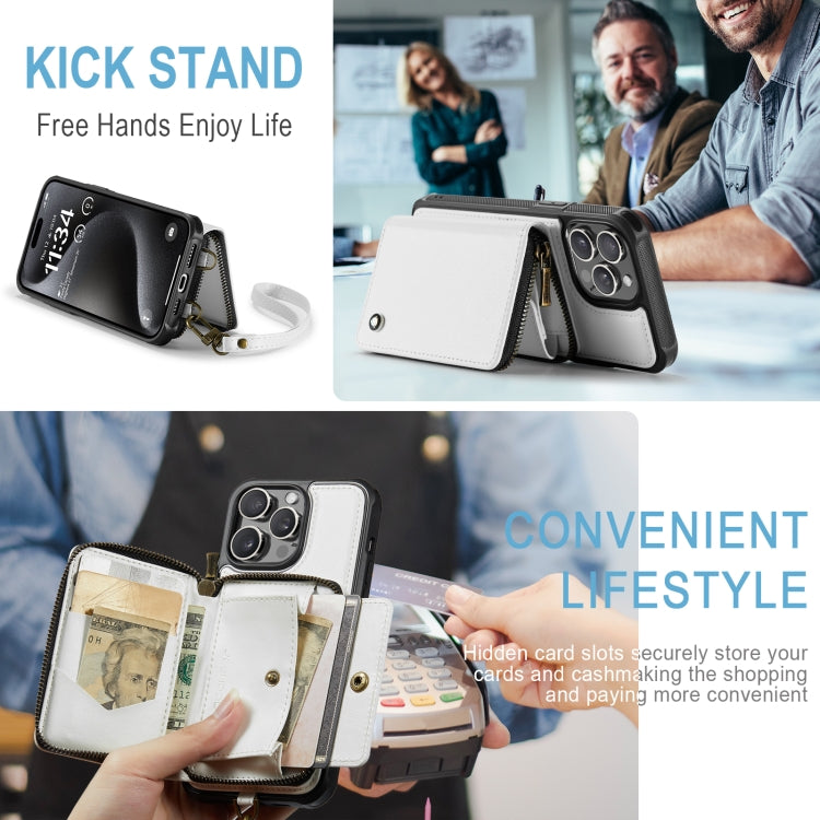 For iPhone 15 Pro JEEHOOD C22 Series Zipper Wallet Leather Phone Case with Dual Lanyard(White)